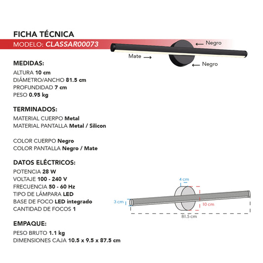 Arbotante Lineal Minimalista CLASSAR00073 – LED Integrado en Acabado Negro
