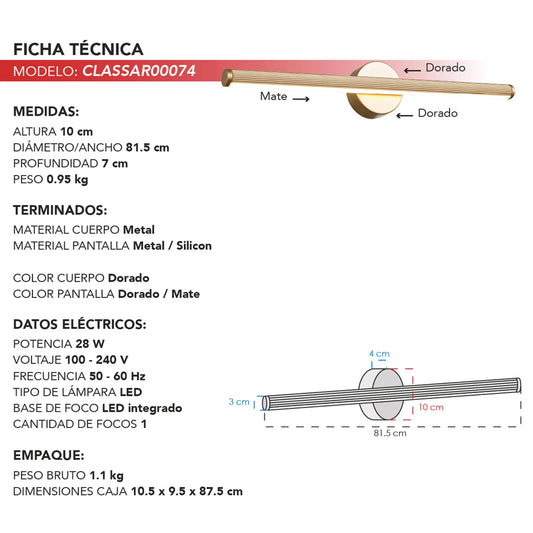 Arbotante LED Minimalista CLASSAR00074 – Línea Horizontal en Dorado Mate
