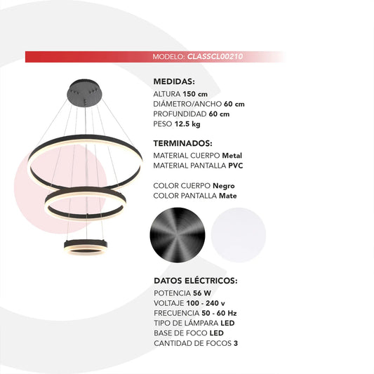 Candil Colgante Minimalista CLASSCL00210 – Triple Aro LED Suspendido en Negro