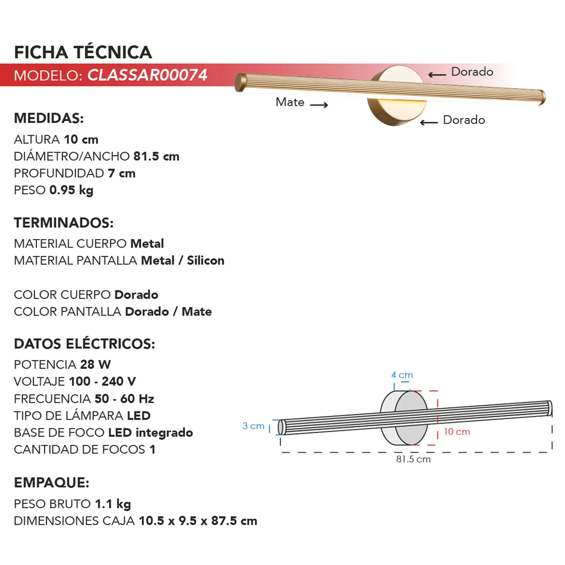 El arbotante CLASSAR00074 es una luminaria de muro de diseño minimalista que destaca por su silueta lineal y proporción equilibrada. Su estructura horizontal aporta una presencia visual limpia y sofisticada, ideal para complementar espacios contemporáneos donde la iluminación se integra como un elemento arquitectónico sutil y funcional.