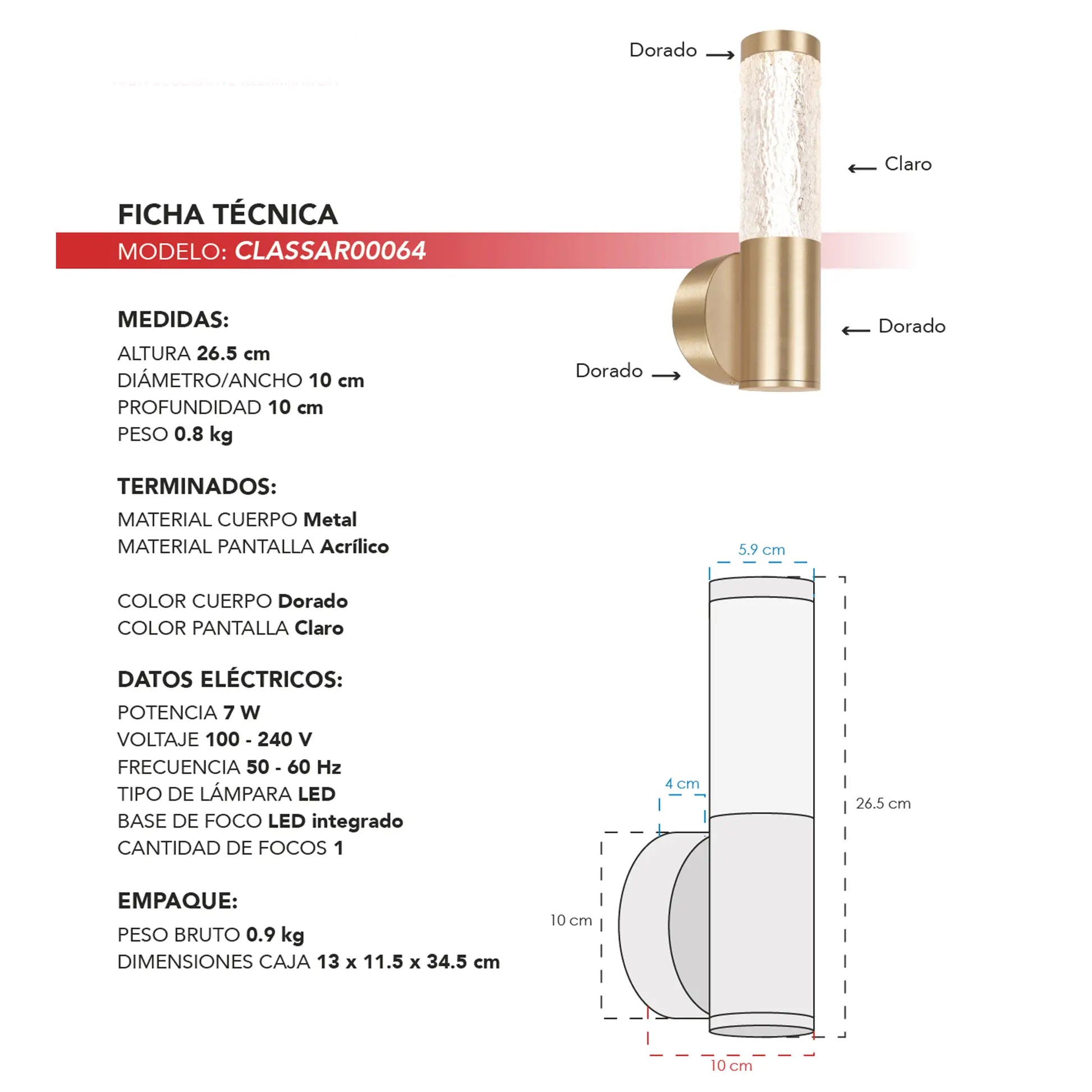 El arbotante moderno CLASSAR00064 destaca por su diseño cilíndrico vertical de líneas limpias y proporciones bien definidas, pensado para integrarse con naturalidad en espacios contemporáneos. Su estética elegante y refinada convierte la iluminación en un elemento arquitectónico discreto, aportando presencia y sofisticación al muro sin saturarlo visualmente.