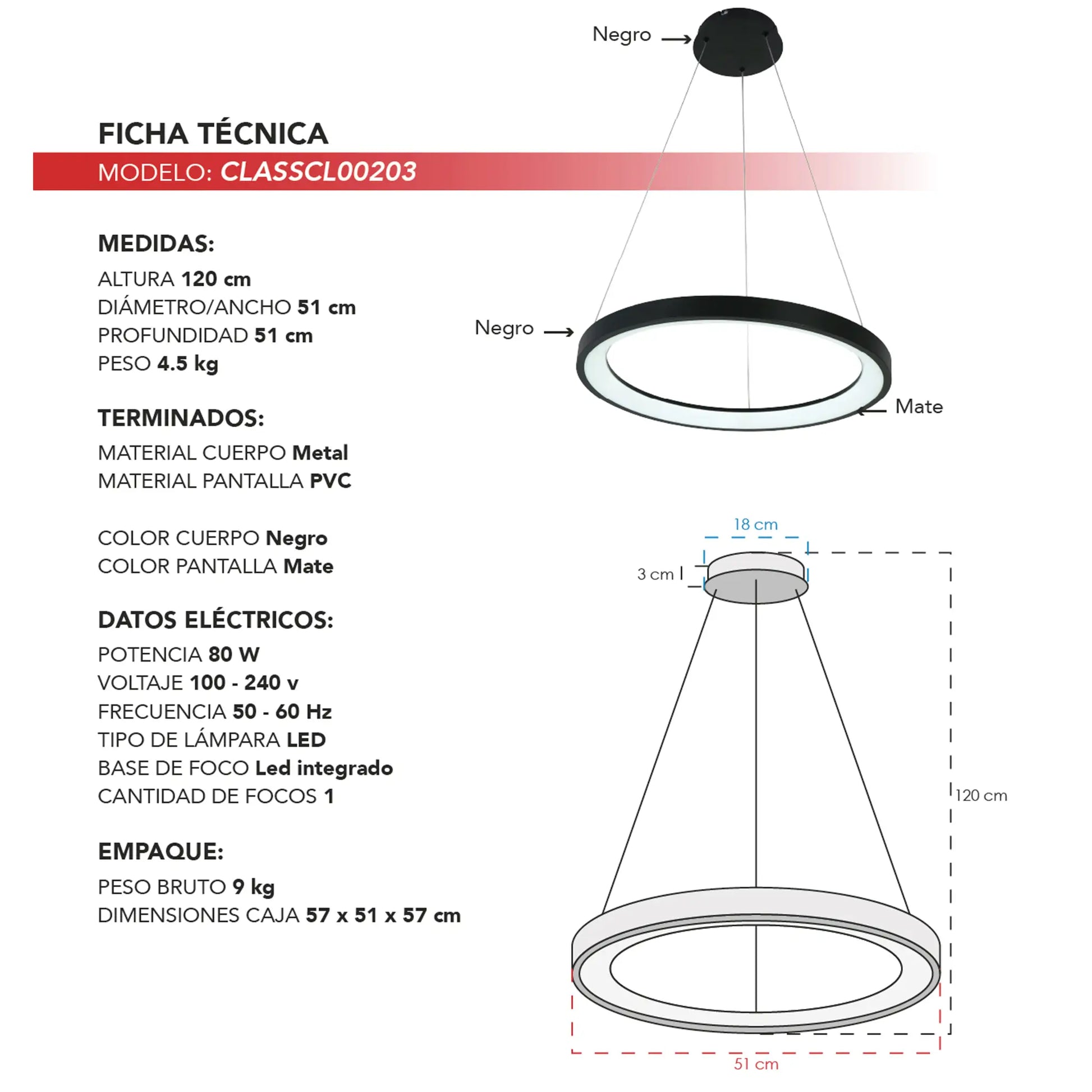 El candil colgante CLASSCL00203 destaca por su diseño circular limpio y equilibrado, pensado para integrarse con naturalidad en espacios contemporáneos donde la iluminación debe acompañar sin saturar. Su forma redonda continua genera una presencia visual serena, convirtiendo la luz en un elemento arquitectónico discreto y bien definido.