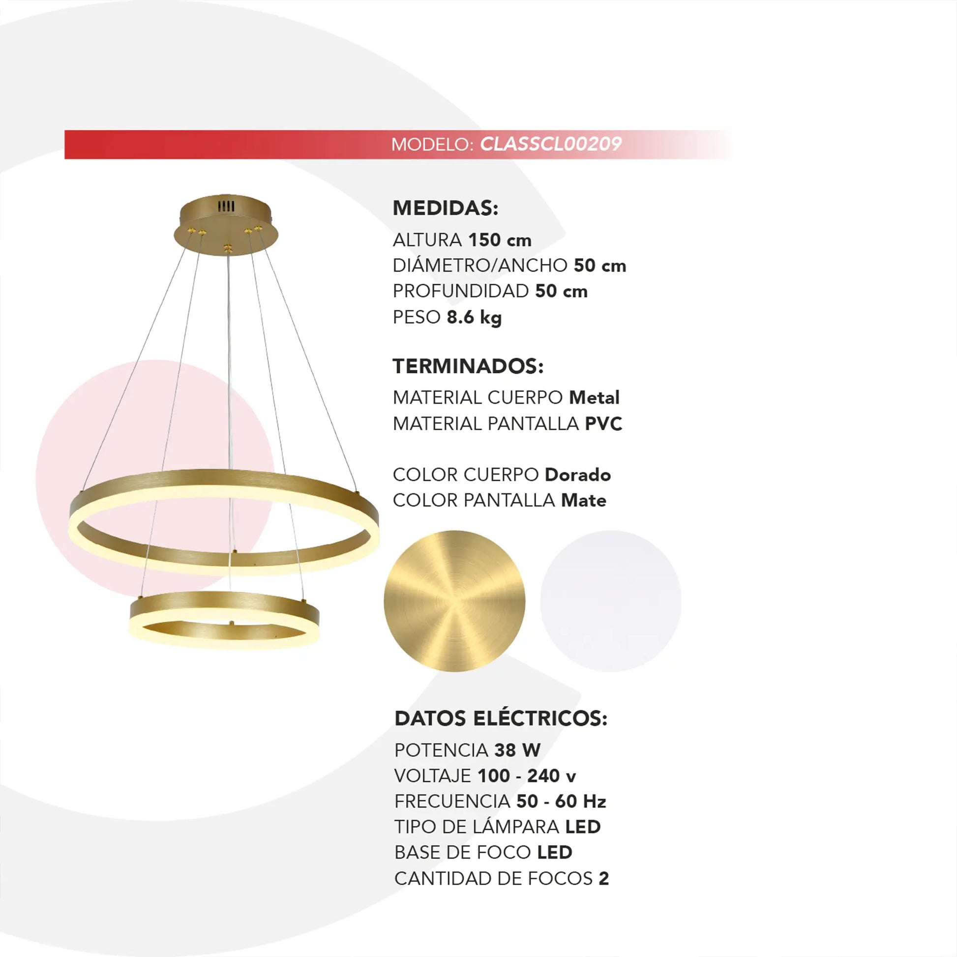 Candil Colgante Minimalista CLASSCL00209 – Doble Aro LED en Acabado Dorado