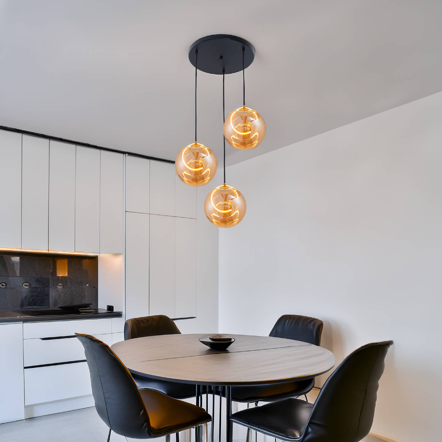 Parte de una base metálica en color negro que se integra de forma discreta al techo, permitiendo que las esferas sean las protagonistas. En su interior, la iluminación LED con borde dorado genera un resplandor cálido que se suaviza al atravesar el vidrio ámbar, creando una atmósfera acogedora y sofisticada.