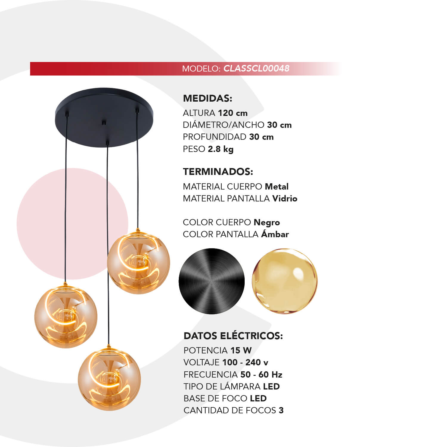 El candil colgante CLASSCL00048 es una pieza de iluminación decorativa diseñada para convertirse en el punto focal de espacios contemporáneos. Su composición de tres esferas de vidrio ámbar, suspendidas a diferentes alturas, crea un efecto visual elegante, dinámico y perfectamente equilibrado.