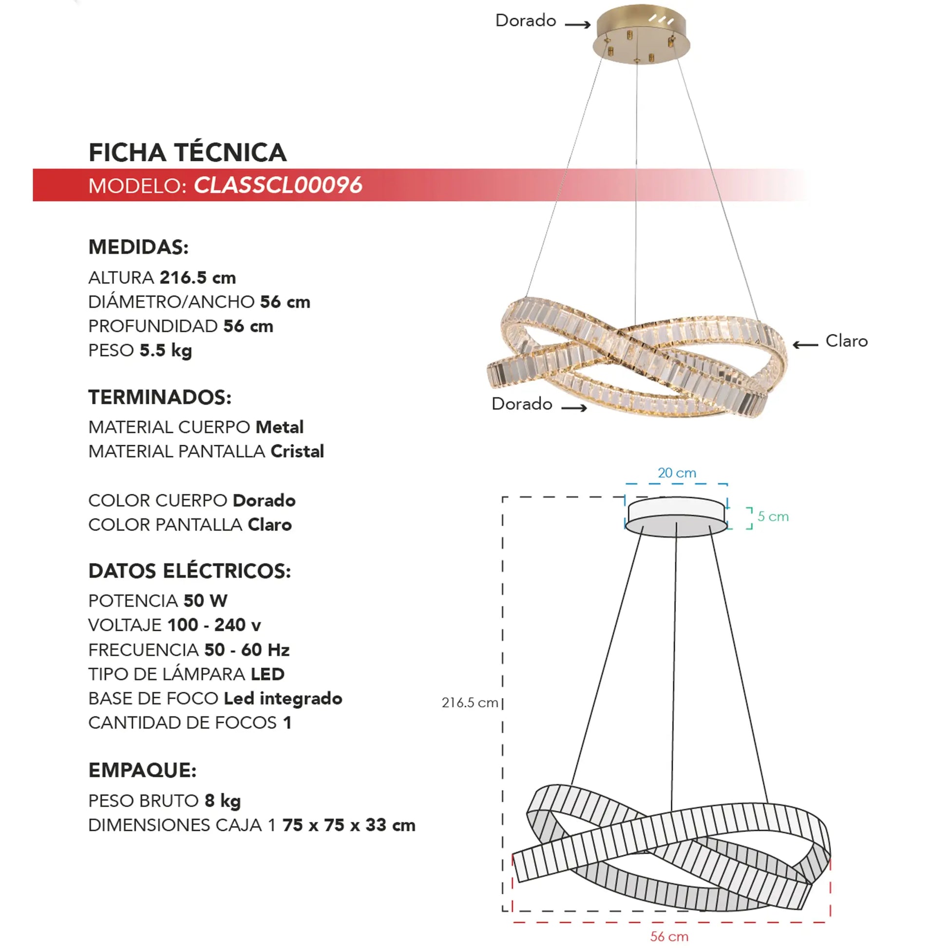 El candil colgante CLASSCL00096 es una luminaria decorativa de diseño moderno que destaca por su estructura escultórica tipo aro entrelazado, creando una composición visual fluida, elegante y altamente sofisticada. Su diseño convierte la iluminación en un elemento artístico que eleva el espacio con presencia y carácter contemporáneo.
