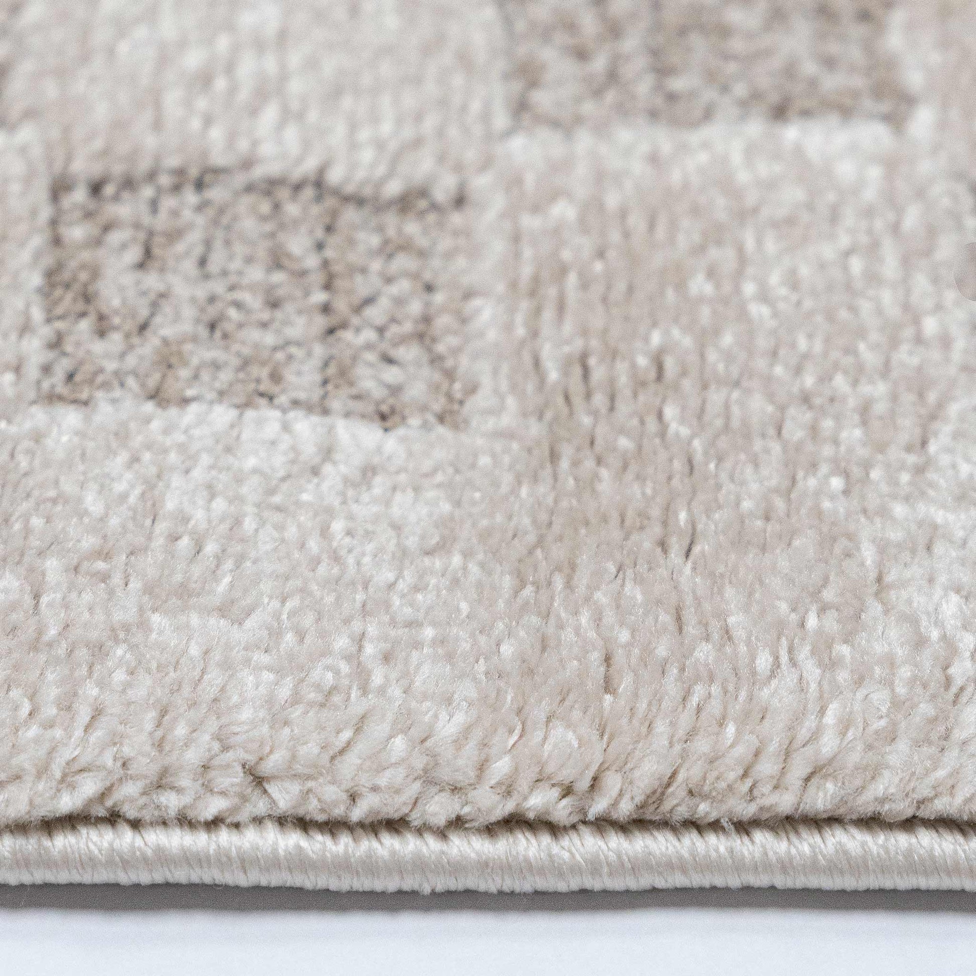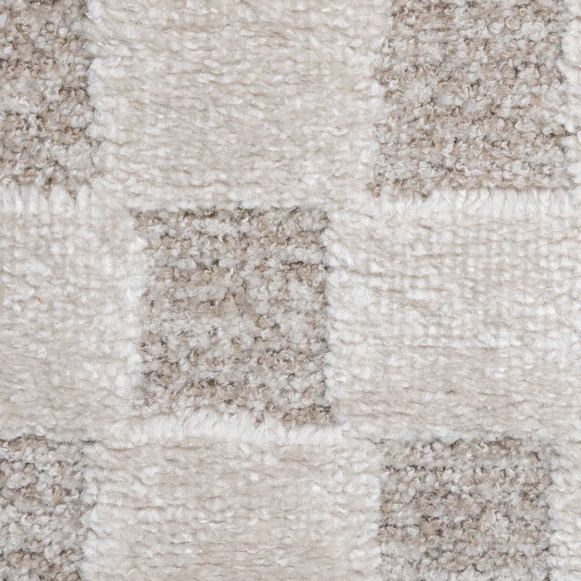 El modelo Aras R3012 destaca por su sofisticado patrón geométrico de cuadros en tonos beige sobre beige, creando un diseño contemporáneo minimalista con efecto de profundidad visual. Su paleta neutra bicolor lo convierte en una pieza versátil que se integra perfectamente en salas modernas, recámaras elegantes o comedores con decoración contemporánea.